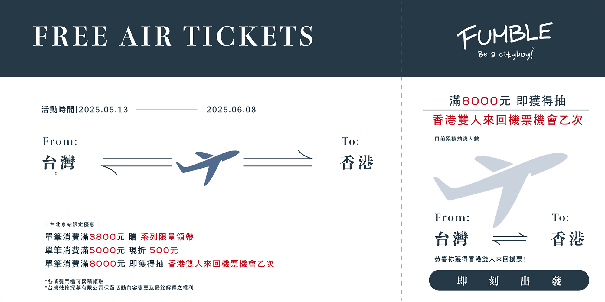 - 單筆消費滿8000元即獲得抽香港雙人來回機票機會乙次。